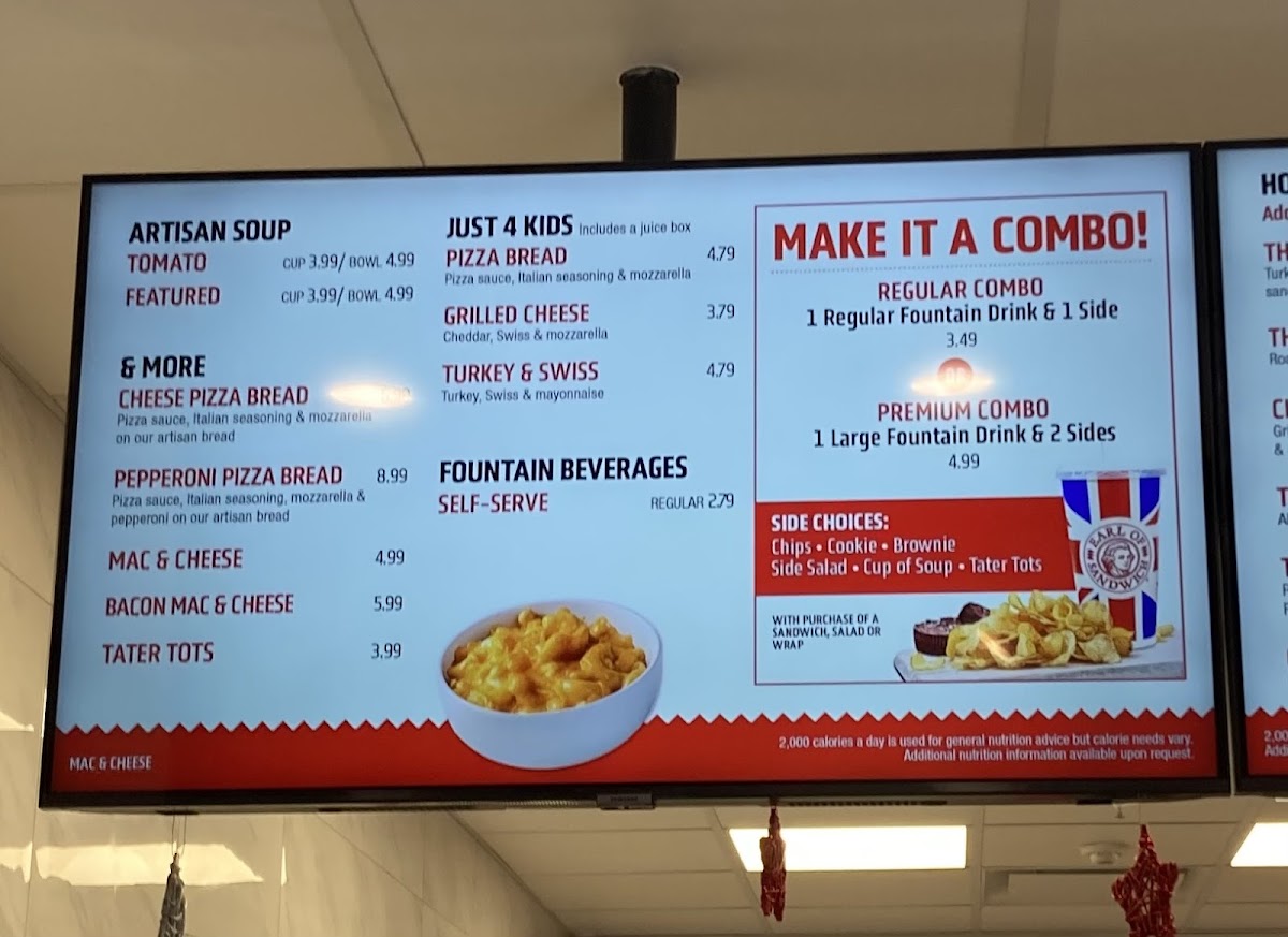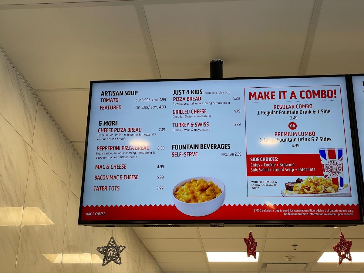 Additional offerings include artisan soups, with tomato soup available, and a variety of sides like potato wedges, tater tots, potato chips, and cannonballs. Customers can also choose to make any meal a combo to round out their order.