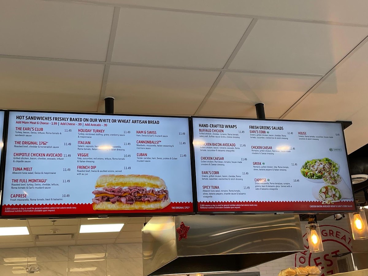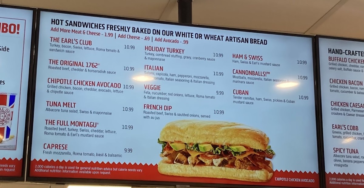 The menu features a variety of freshly prepared sandwiches and wraps, designed for quick and satisfying meals. Hot sandwiches include options such as turkey clubs, roast beef with cheddar, chipotle chicken avocado, and tuna melt, offering a range of classic and specialty choices.